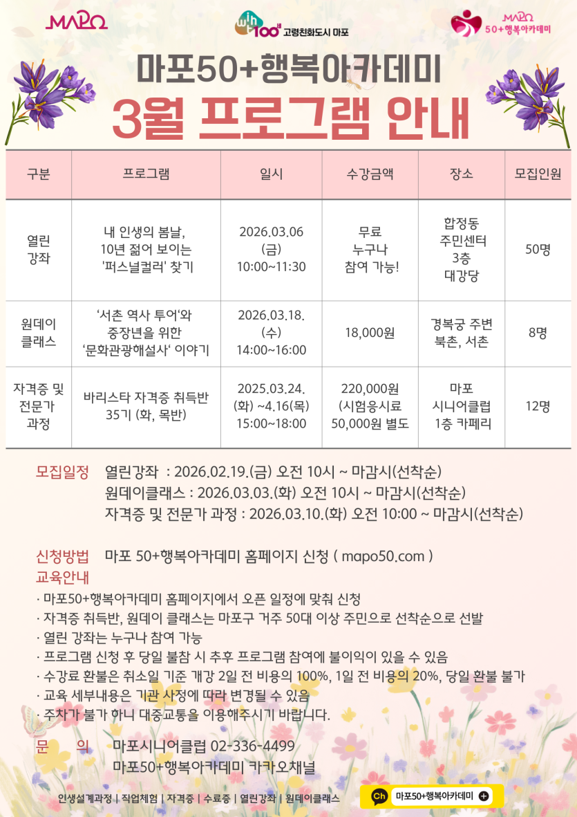- 마포시니어클럽 02-336-4499 (행복아카데미 담당자)
